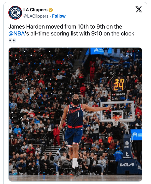 Harden didn’t just quietly pass the mark, either. He finished the night with 32 points and 10 assists in the Clippers’ 117–109 win, showing the full offensive package that has defined his career. He scored at every level — 11 points in the first quarter, 11 more in the third, and eight in the fourth — pushing his career total to 28,614 by the final buzzer.