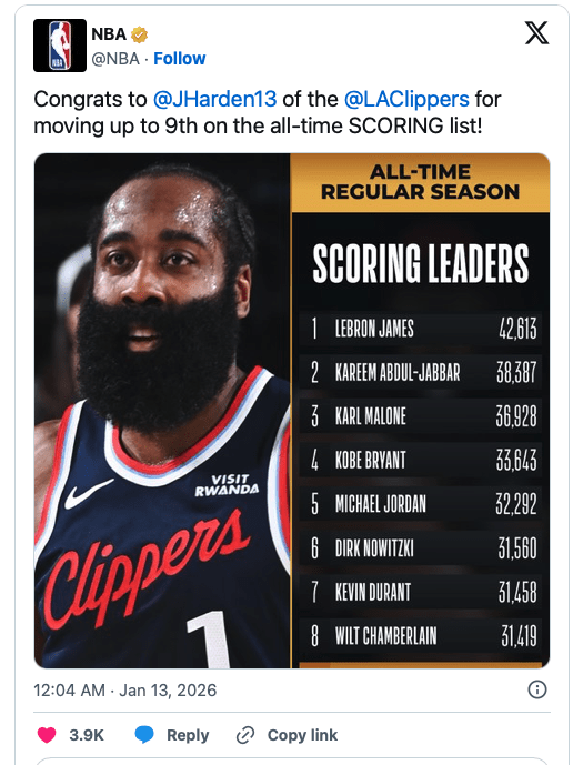 The climb ahead remains steep. Wilt Chamberlain, sitting eighth all-time with 31,419 points, looms as Harden’s next target, while LeBron James continues to stretch the record books at the very top.