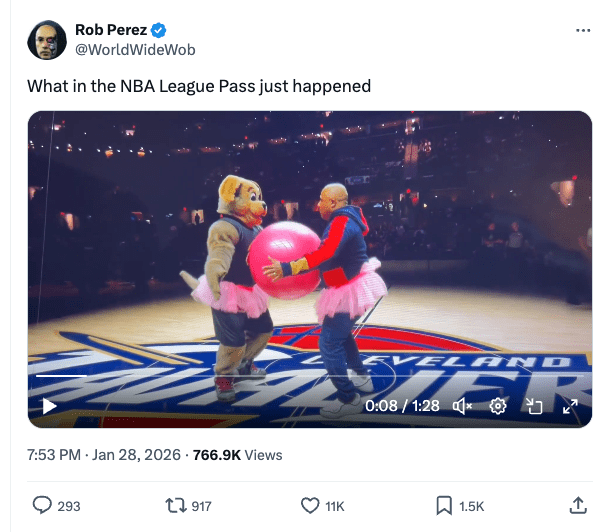 The original moment unfolded during a timeout in Cleveland’s matchup against the Los Angeles Lakers. The Cavaliers’ in-arena host and team mascot appeared wearing pink tutus, slowly moving around the court while holding a large pink exercise ball. As if that wasn’t surreal enough, the performance was set to Adele’s emotional ballad “Hello,” creating a scene that left fans equal parts confused and entertained.