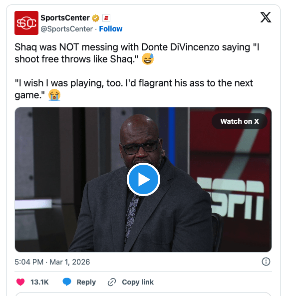 The broadcast showed Timberwolves guard Donte DiVincenzo missing a free throw. Mic’d up, DiVincenzo joked to teammates, “I shoot free throws like Shaq.”